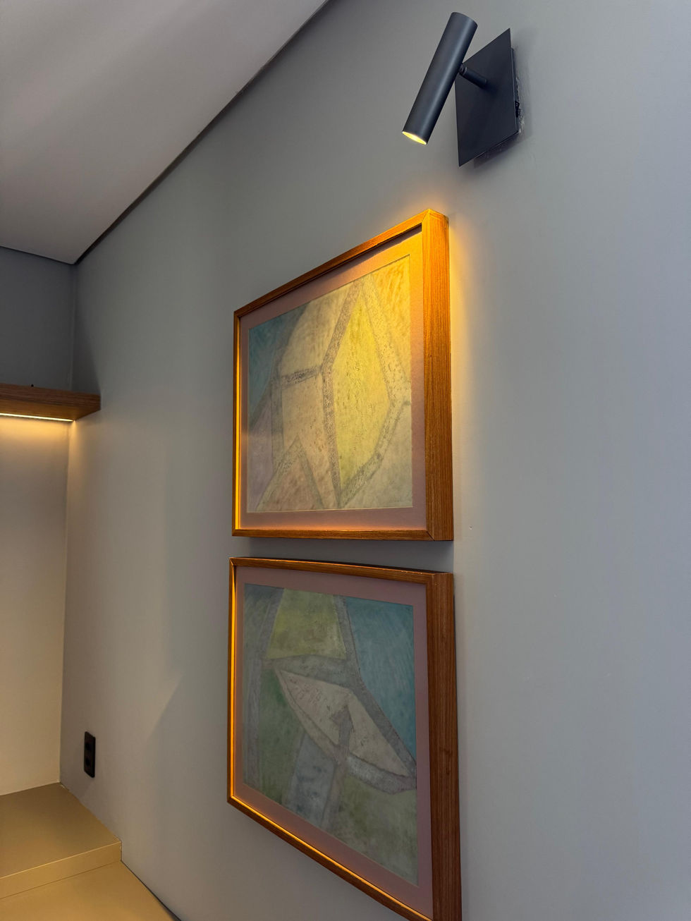O projeto de interiores, realizado pelo Arquiteto João Pedro, reforça a identidade do imóvel com uma atmosfera de luxo e sofisticação. A iluminação desempenha um papel fundamental, com fitas de LED e luminárias que realçam texturas e cores. Ambientes como a área gourmet e os banheiros demonstram a atenção aos detalhes e o uso de materiais de alta qualidade. A combinação de bancadas brancas, metais pretos e revestimentos com efeito de concreto e madeira cria um contraste elegante e moderno, enquanto a escada iluminada e as obras de arte conferem um toque de personalidade e aconchego.